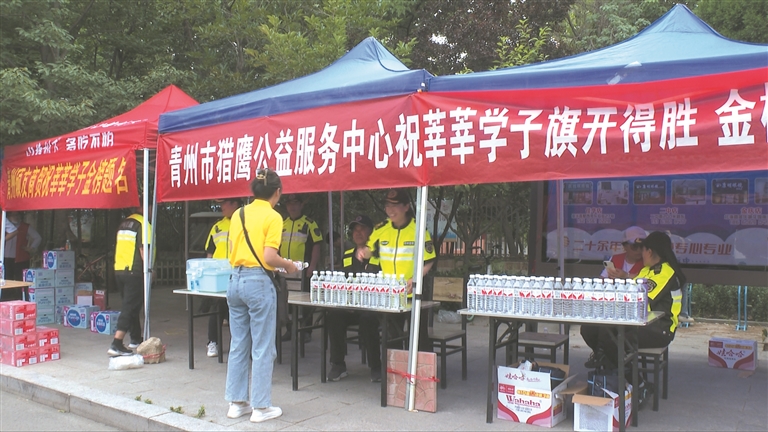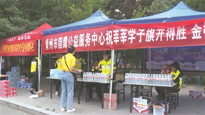 在青州三中考点外,青城义工的志愿者们搭建了遮阳帐篷,摆放桌椅,设立志愿服务站点,为考生和家长提供服务与帮助,在炎热的户外为他们带去一丝清凉和一份关爱。