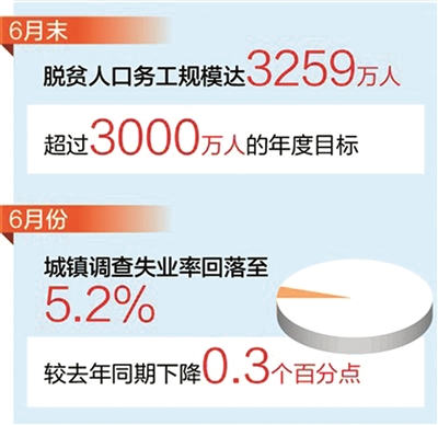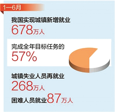 人社部就业促进司副司长陈勇嘉介绍,今年以来,城镇调查失业率整体呈下降趋势,6月份回落至5.2%,较去年同期下降0.3个百分点。1~6月,我国实现城镇新增就业678万人,完成全年目标任务的57%。此外,困难群体就业得到积极保障。6月末,脱贫人口务工规模达3259万人,超过3000万人的年度目标。1~6月,城镇失业人员再就业268万人、困难人员就业87万人,同比均有所增加。