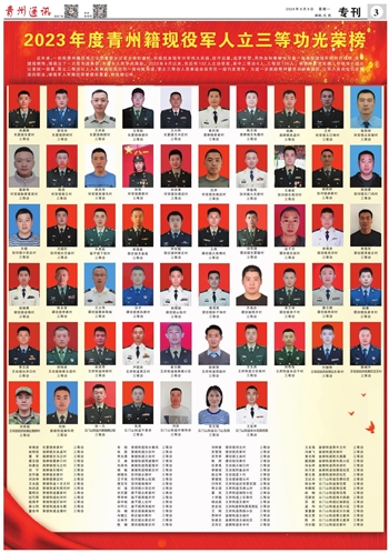 近年来,一批批青州籍优秀儿女带着家乡父老乡亲的重托,积极投身强军兴军伟大实践,驻守边疆,追梦军营,用热血和奉献书写着一曲曲强国强军的时代战歌,连年捷报频传,涌现出了一大批先进典型,为家乡人民争光添彩。2023年8月以来,先后有132人立功受奖,其中二等功6人,三等功126人。根据潍坊市双拥工作领导小组办公室统一部署,荣立二等功以上人员事迹在潍坊市一级刊发报道,荣立三等功人员事迹由县市区一级刊发宣传。为进一步激励青州籍官兵献身国防,让军人成为全社会尊崇的职业,增强军人军属的荣誉感自豪感,特张榜公布。