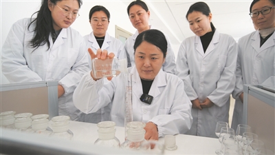 鼻子轻嗅、舌尖微品,一杯酒的香型、特点便在舌尖上跃然浮现。酒体设计主任武金玲和同事们赶紧将这些数据一一记录下来。长期的实验训练早已让她们建立起舌尖上的“酒香博览室”。