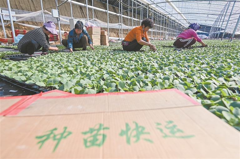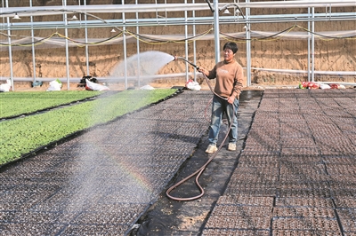 图为,谭坊镇王家羊村一处育苗基地,农民在苗棚里忙碌。