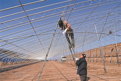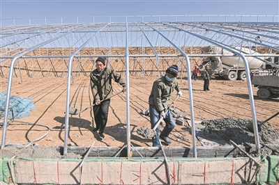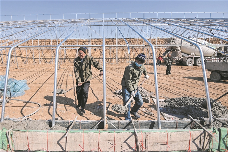 图为谭坊镇王家羊村一处智能温室建设现场,工人在施工作业。