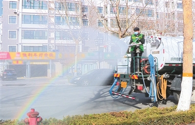 在旗城路,园林工人正利用水车浇灌、喷灌等方式,对城区主次干道、公园、广场等公共区域的绿化带进行全面浇灌,确保植物有充足水分顺利返青。
