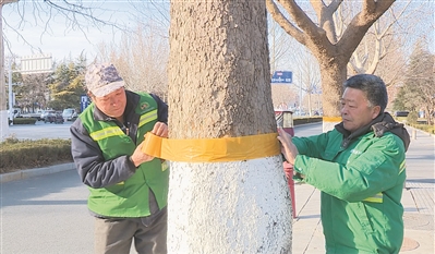 在昭德路与瓜市路路口,园林工人正在对行道树实施防虫等措施。春季以来,市园林绿化和环卫中心坚持“预防措施先行+综合防治保障+绿植抗性提升”的原则,积极开展物理防治工作,有效预防各类病虫害。