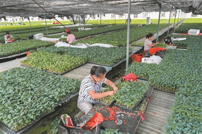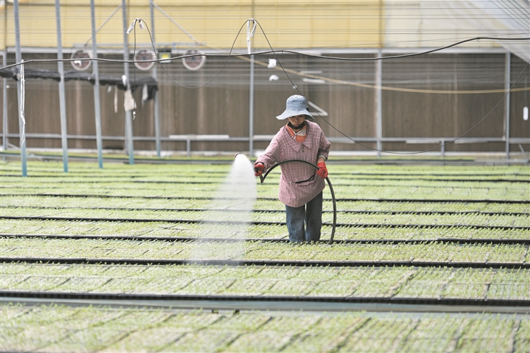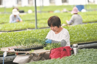 图为,青州双福农业科技发展有限公司育苗大棚内,工人在培育蔬菜秧苗。